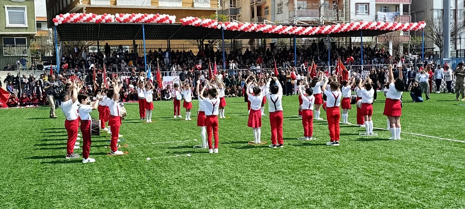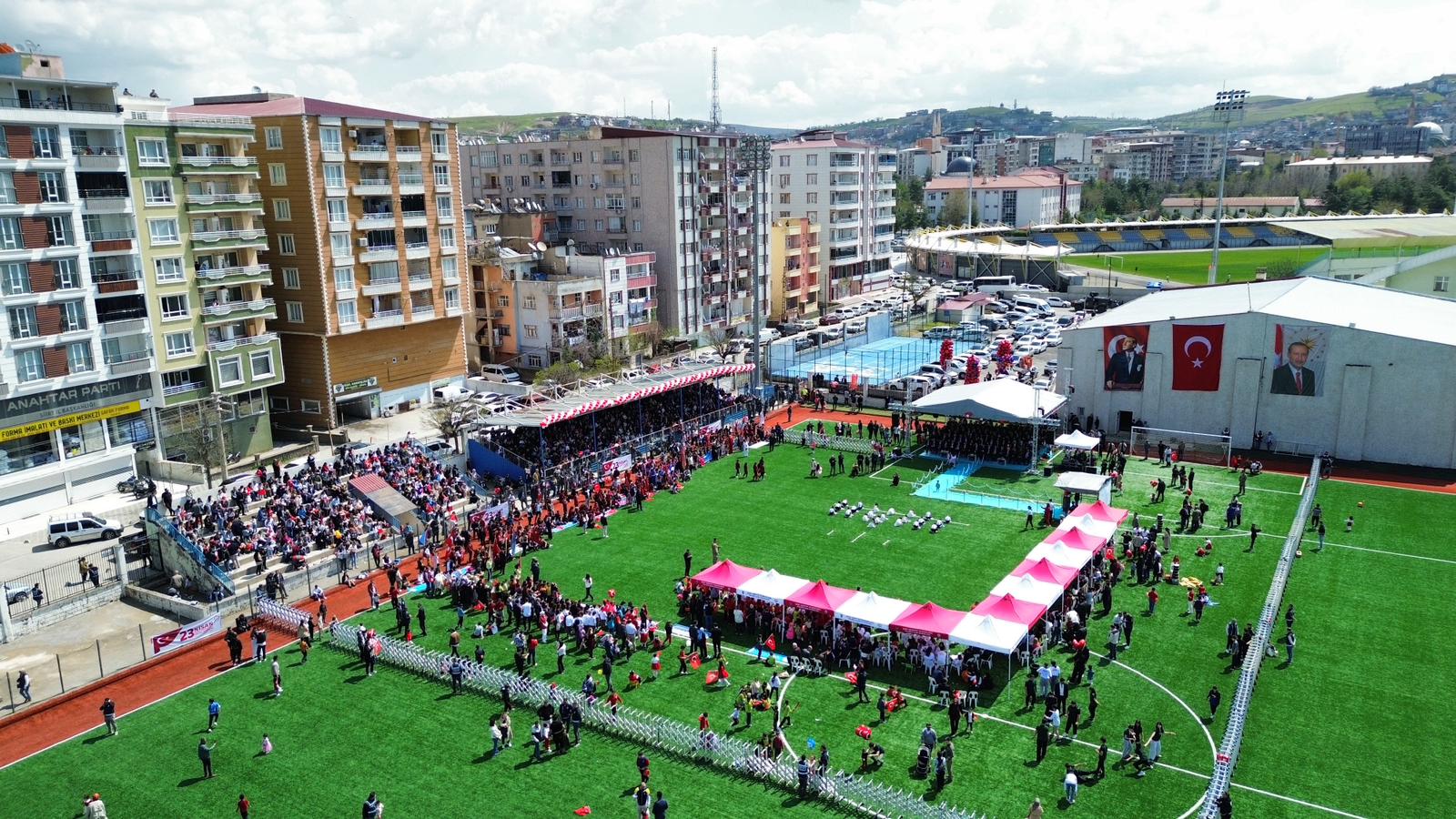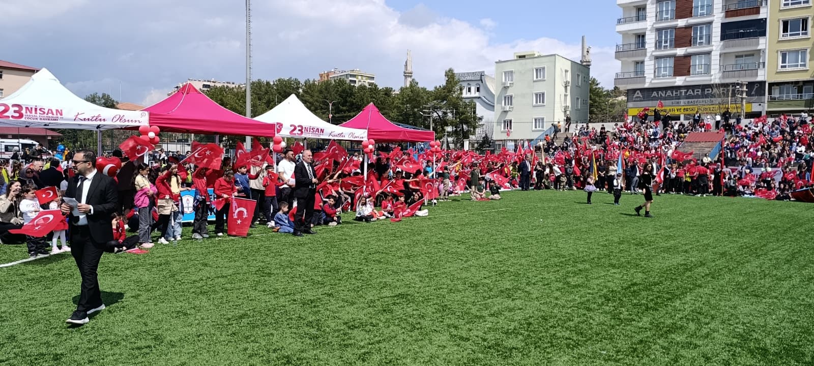 23 Nisan Ulusal Egemenlik ve Çocuk Bayramı kutlamaları, sabah Cumhuriyet Meydanı’nda Atatürk Anıtı’na çelenk konulması, saygı duruşu ve İstiklal Marşı’nın okunmasıyla başladı. Törenler, ‘2 Nolu Sentetik Çim Saha’da gerçekleştirilen çeşitli etkinliklerle devam etti.