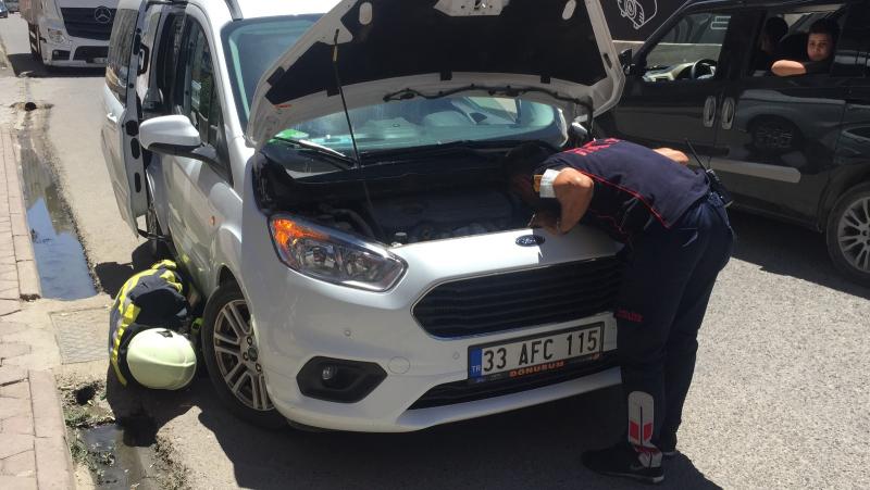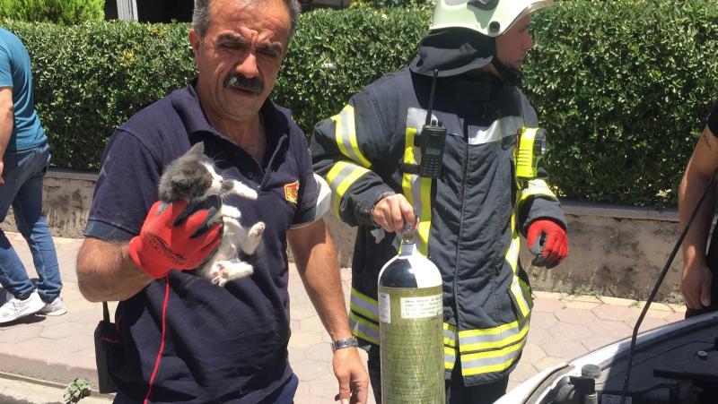 Olay yerine sevk edilen ekipler yavru kediyi araçta sıkıştığı bölümden çıkardı.