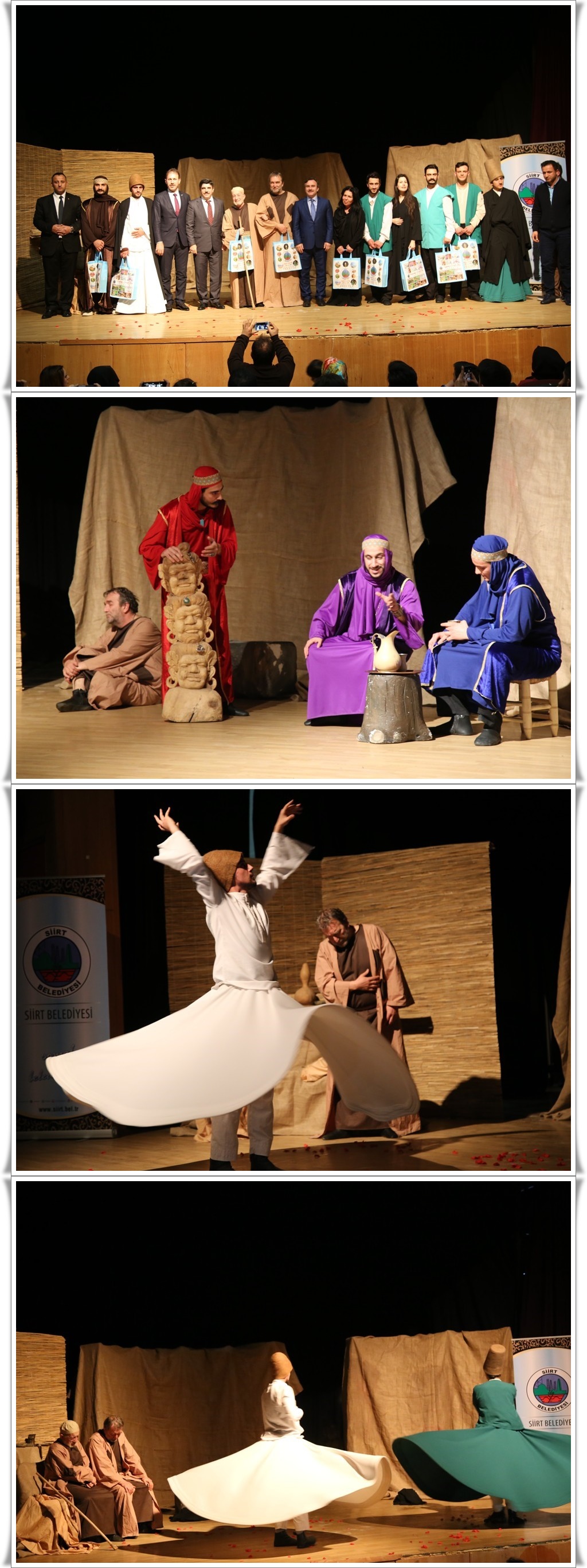 Siirt Belediyesi tarafından düzenlenen “Bir Garip Üveys, Kül ve Gül Mevsimi” tiyatro gösterisi büyük beğeni topladı. Siirt Kültür ve Turizm Müdürlüğü Konferans salonunda gerçekleştirilen tiyatro gösterisine AK Parti Siirt Milletvekili Prof. Dr. Yasin Aktay, Siirt Belediye Başkan Vekili Ceyhun Dilşad Taşkın, AK Parti Siirt İl Başkanı Fuat Özgür Çalapkulu, kamu kurum müdürleri, sivil toplum örgütlerinin temsilcileri ve çok sayıda tiyatro sever katıldı. İslamiyet’in doğuşu, Peygamber Efendimiz Hz. Muhammed (S.A.V) ve Veysel Karani hakkında bilgilerin verildiği tiyatro gösterisi izleyicilerden tam not aldı.