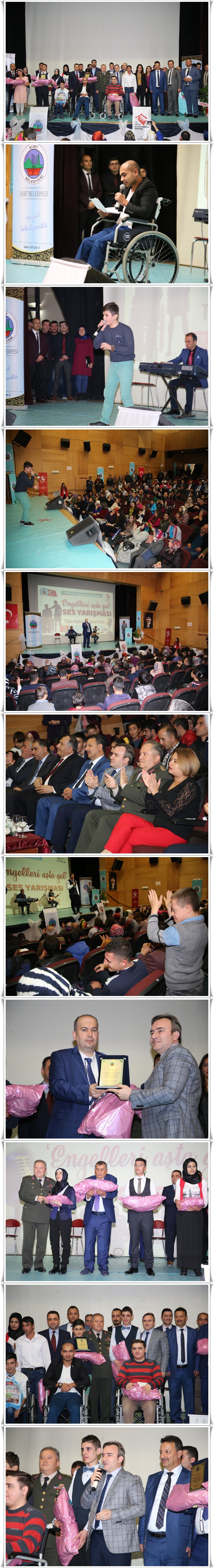 “Engelleri Aşta Gel” ses yarışmasına katılım sağlayan tüm yarışmacılara ödülleri Siirt Belediye Başkan Vekili Ceyhun Dilşad Taşkın, Siirt Üniversitesi Rektörü Prof. Dr. Murat Erman, İl Jandarma Alay Komutan Yardımcısı Albay Erol Ürküt ve Aile ve Sosyal Politikalar İl Müdürü Gökhan Marakçı tarafından verildi.