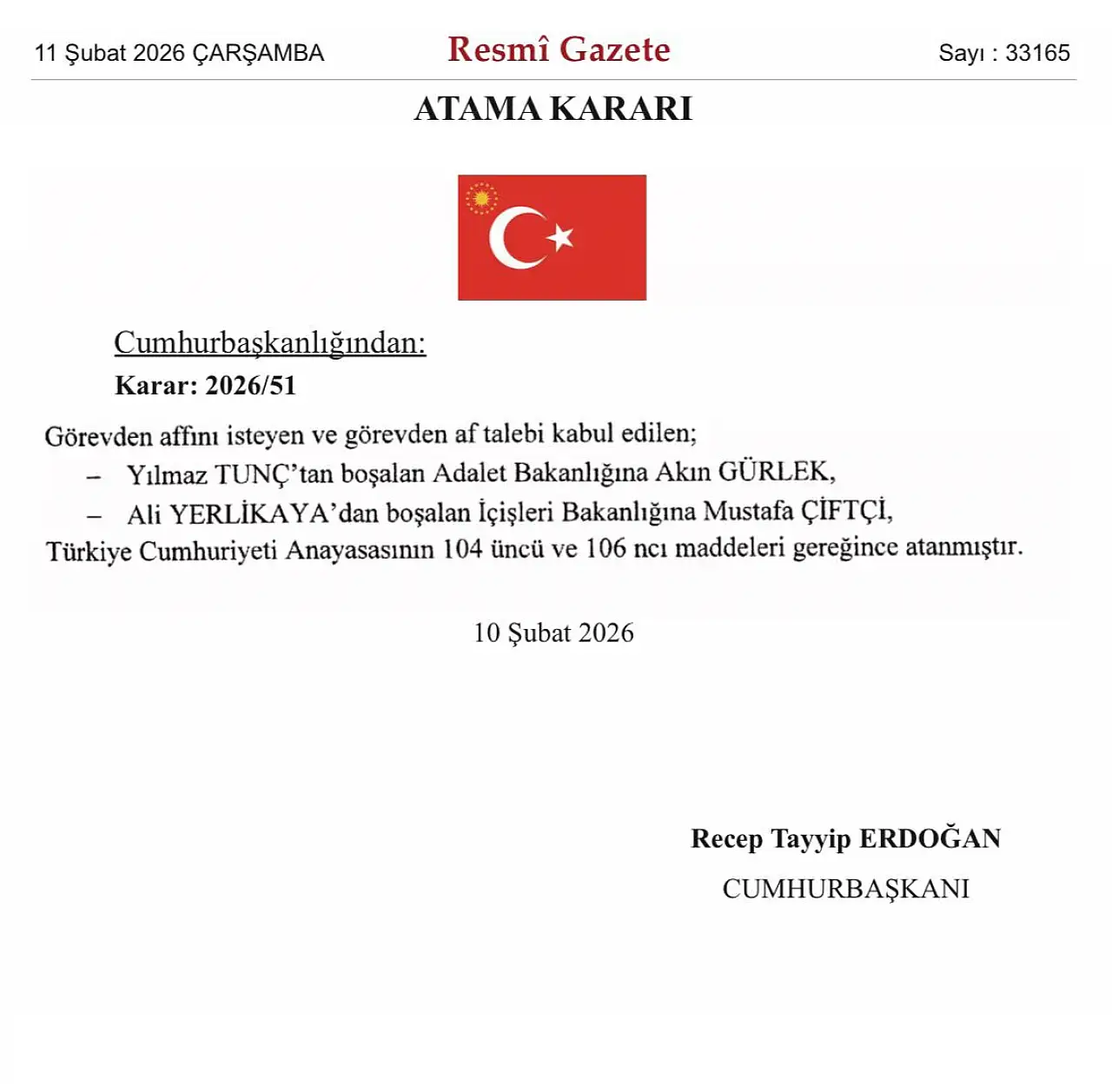 Cumhurbaşkanlığı’nın 2026/51 sayılı kararıyla, görevden af talebi kabul edilen isimlerin yerine yeni atamalar yapıldı. Buna göre Yılmaz Tunç’tan boşalan Adalet Bakanlığı görevine Akın Gürlek, Ali Yerlikaya’dan boşalan İçişleri Bakanlığı görevine ise Mustafa Çiftçi atandı.