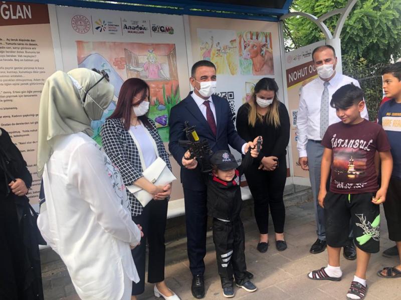 Kooperatif Mahallesindeki durağa eşi Güney Hacıbektaşoğlu ile birlikte giden Vali Osman Hacıbektaşoğlu, Milli Eğitim Müdürü Deniz Edip ve proje koordinatörü Başak Aydoğdu’dan bilgi alarak, uygulamaya girdi ve masal dinledi.