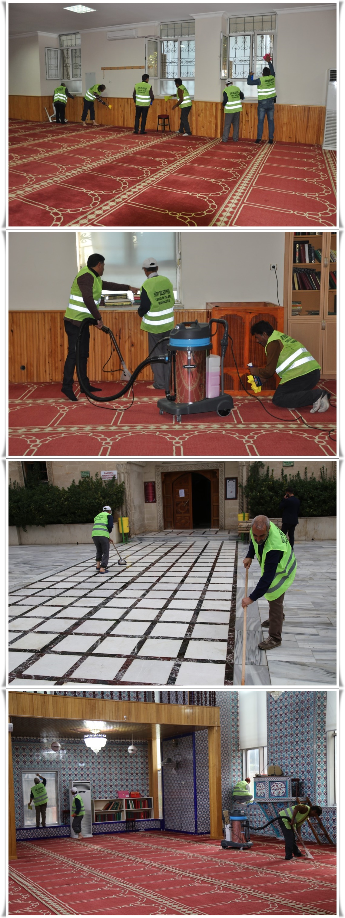 Siirt Belediyesi Temizlik İşleri Müdürlüğü bünyesinde gerçekleştirilen çalışmalar kapsamında cami içindeki halıların süpürülüp yıkanması, kapı, camların silinmesi, minber temizliği, ayakkabılıklar, kitaplıklar ve duvarlarda asılı tablolara kadar geniş çaplı bir şekilde temizlik yapılıyor.