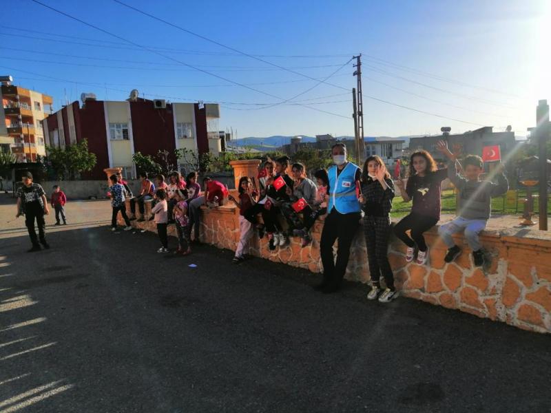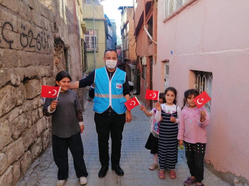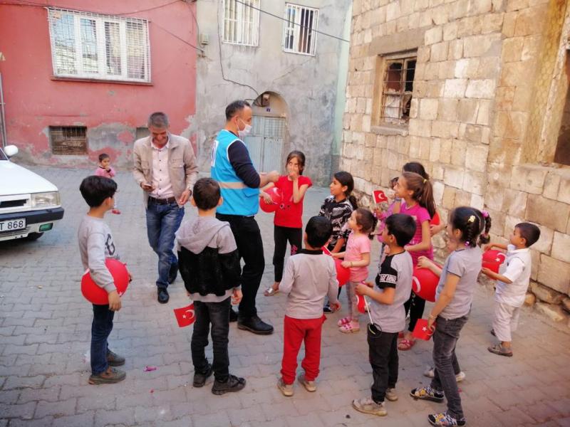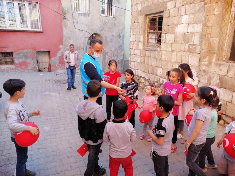 Kültür ve Sosyal İşler Müdürlüğü ekipleri, Barış, Algül, Doğan, Batı ve İnönü Mahallesindeki çocukların 23 Nisan Ulusal Egemenlik ve Çocuk Bayramını kutlayarak, kendilerine ay yıldızlı, balon, bayrak ve çikolata hediye etti.