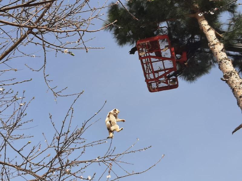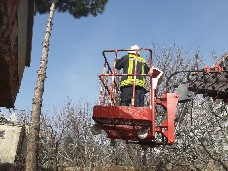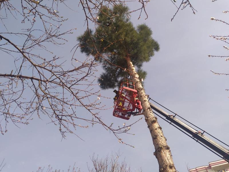 Edinilen bilgilere göre, Veysel Karani Mahallesi Mezopotamya Sitesi mevki’inde bulunan bir çam ağacına çıkan kedi aşağı inemedi. 2 gündür ağaçtan inemediği öğrenilen kediyi fark eden mahalle sakinleri durumu itfaiye ekiplerine bildirdi. Kısa sürede belirtilen adrese gelen itfaiye ekipleri kedinin kurtarılması için çalışma başlattı. Ekipler mahsur kalan kediyi bulunduğu yerden kurtaracağı sırada kedi kendini aşağı bıraktı. İtfaiye ekipleri her ihtimale karşı açtıkları battaniyeye düşen kedi kurtarıldı.