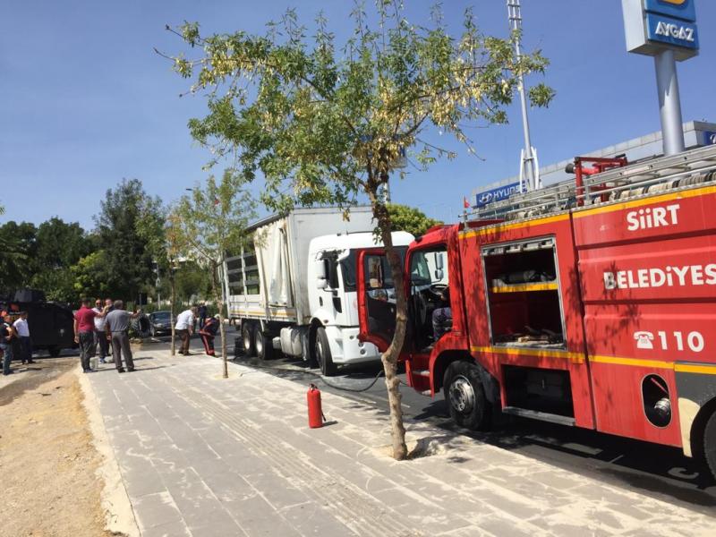 Edinilen bilgiye göre, Siirt-Kurtalan yolu Fikret Petrol mevkisinde 06.BJ 70203 şöför İsmail Beyaz mühimmat yüklü olduğu belirtilen seyir halindeki tırın balata kısmında aşırı ısınmadan dolayı yangın çıktı.
