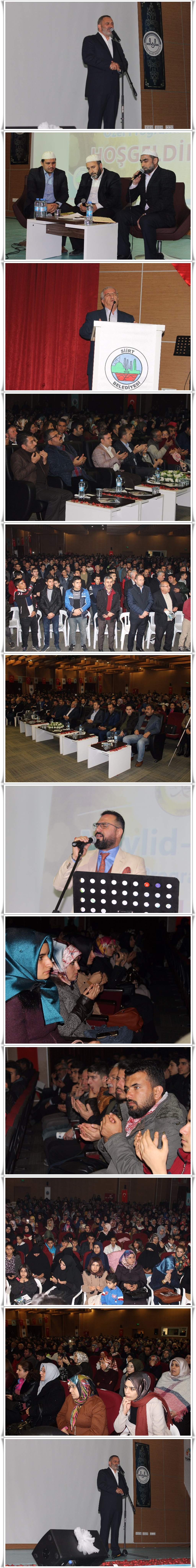 Mevlid-i Nebi Haftası nedeniyle Siirt Belediyesi ve İl Müftülüğü tarafından organize edilen Dursun Ali Erzncanlı ile Mevlid-i Nebi Özel Programı TÜRGEV Konferans salonunda düzenlendi. Vatandaşların akın akın salonu hınca hınç doldurdukları etkinliğe, Siirt Belediye Başkan Vekili Ceyhun Dilşad Taşkın, AK Parti Siirt İl Başkanı Fuat Özgür Çalapkulu, Siirt İl Müftüsü Faruk Arvas, Daire ve Kurum amirleri, Din görevlileri ve çok sayıda vatandaş katıldı.