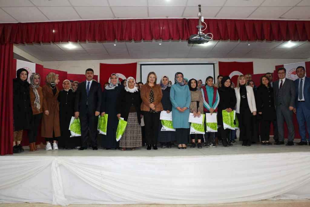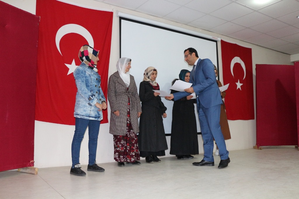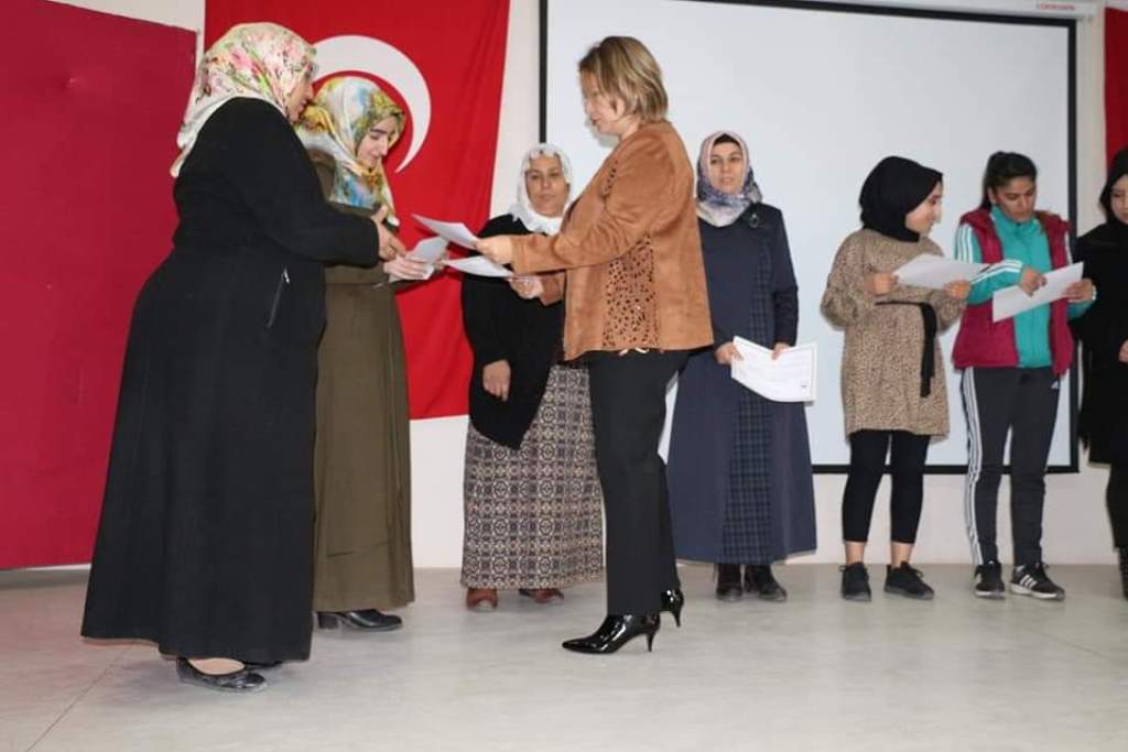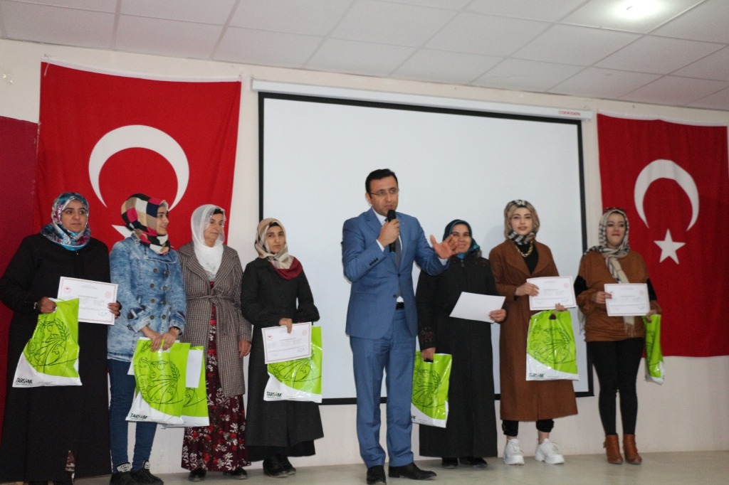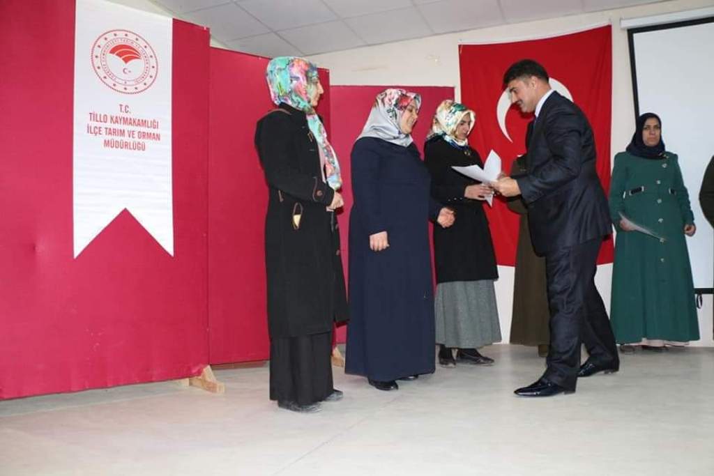 Bu kapsamda Siirt Valimiz Sayın Ali Fuat Atik’in kıymetli eşleri Sayın Fulya ATİK, Tillo Kaymakamı Sayın Lokman DÜZGÜN, Tarım ve Orman İl Müdürümüz Sayın Ergün Demirhan, Çalışma ve İş-Kur İl Müdürü Sayın Ömer Aslan ve Tillo İlçe Kurum ve Kuruluş amirlerinin katılımlarıyla Tarımsal Eğitim Kurslarını başarıyla bitiren kadın çiftçilere sertifikaları ve hediyeleri takdim edildi. Bu amaçla; Asma Yetiştiriciliği 25 Kadın ve Sürü Yönetimi 25 Kadın olmak üzere toplamda 50 kadın çiftçimiz mesleki eğitim sertifikalarını alarak kursları başarıyla tamamladı. Sertifika töreni sonrası kadın çiftçilerimiz ile bir araya gelen Sayın Fulya ATİK Hanımefendi kadın çiftçiler ile sohbet etti. Ardından Tillo Kaymakamı Sayın Lokman Düzgün İlçe Tarım ve Orman Müdürlüğü personelini gayretli çalışmalarından dolayı tebrik ederek, Tillo İlçesinde çiftçilere yönelik tarım kütüphanesi yapmayı hedeflediklerini ifade etti. İl Müdürümüz Sayın Ergün Demirhan tarımsal eğitim kurslarının bitiren kadın çiftçileri tebrik etti. İş-Kur müdürü Ömer Aslan bu tür kursların iş birliği içinde devam edeceğini belirtti.