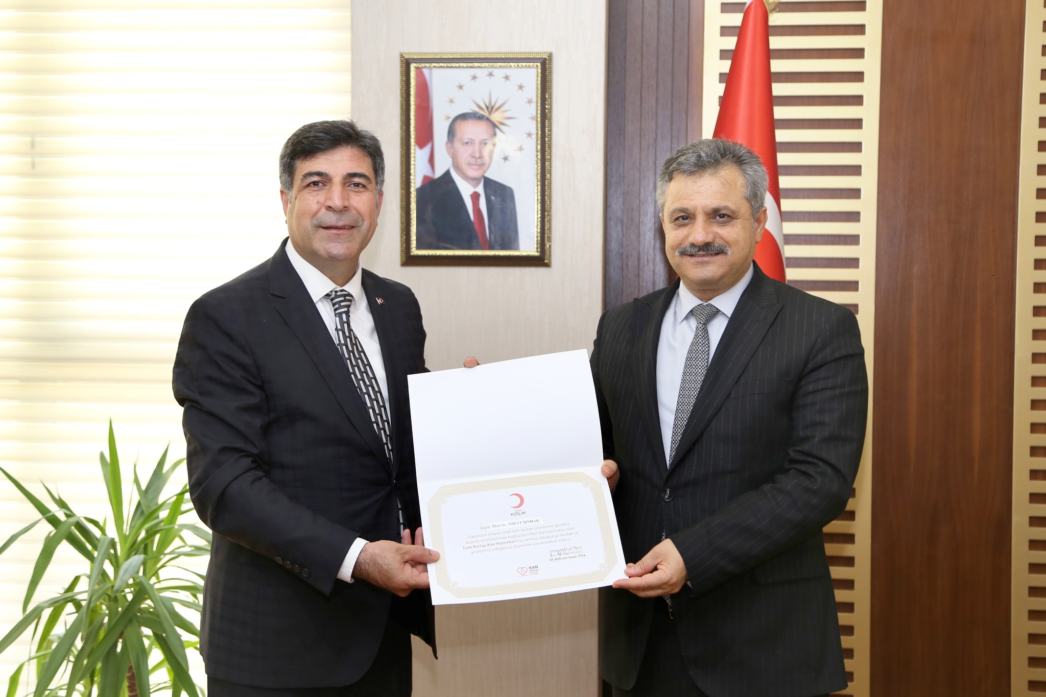 Ziyaret kapsamında, Türk Kızılay Kan Hizmetlerine vermiş olduğu desteklerden ötürü Rektörümüz Prof. Dr. Nihat Şındak’a teşekkür belgesi ve plaket takdiminde bulunuldu.