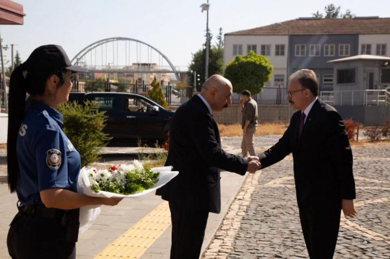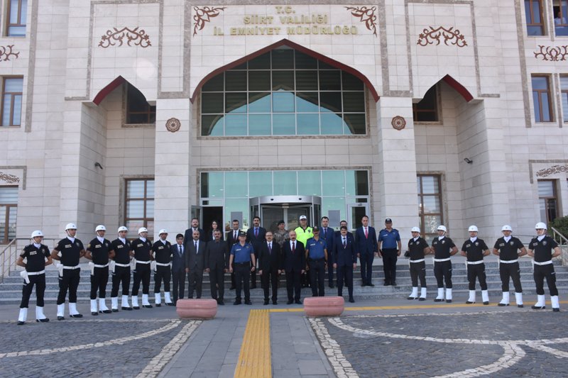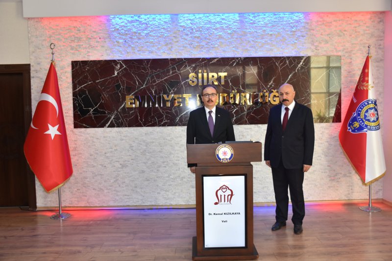 Vali/Belediye Başkan Vekili Dr.Kemal Kızılkaya, Siirt İl Emniyet Müdürlüğü'nü ziyaret etti. Programları kapsamında ziyaretler gerçekleştiren Vali/Belediye Başkan Vekili Dr.Kemal Kızılkaya, bu kapsamda Siirt İl Emniyet Müdürlüğünü ziyaret etti. Emniyet Müdürlüğü Merasim Mangası tarafından karşılanan Vali Kızılkaya, tören mangasını selamladıktan sonra, İl Emniyet Müdürlüğü'nün ilimizdeki çalışmaları hakkında İl Emniyet Müdürü Hakan Yıldırımoğlu’ndan brifing aldı. Vali Dr. Kemal Kızılkaya, asayiş, trafik, uyuşturucuyla mücadele başta olmak üzere Siirt’te güven ve huzur ortamının sağlanması noktasında yürütülen çalışmalarla ilgili bilgi aldı. Vali Kızılkaya, ilimizdeki huzur ortamını sağlayan emniyet teşkilatı mensuplarına da teşekkür ederek, çalışmalarında başarılar diledi.